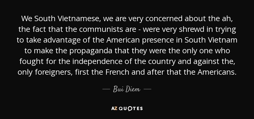 We South Vietnamese, we are very concerned about the ah, the fact that the communists are - were very shrewd in trying to take advantage of the American presence in South Vietnam to make the propaganda that they were the only one who fought for the independence of the country and against the, only foreigners, first the French and after that the Americans.