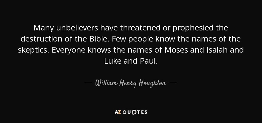 Many unbelievers have threatened or prophesied the destruction of the Bible. Few people know the names of the skeptics. Everyone knows the names of Moses and Isaiah and Luke and Paul.