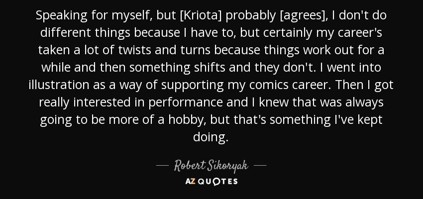 Speaking for myself, but [Kriota] probably [agrees], I don't do different things because I have to, but certainly my career's taken a lot of twists and turns because things work out for a while and then something shifts and they don't. I went into illustration as a way of supporting my comics career. Then I got really interested in performance and I knew that was always going to be more of a hobby, but that's something I've kept doing.