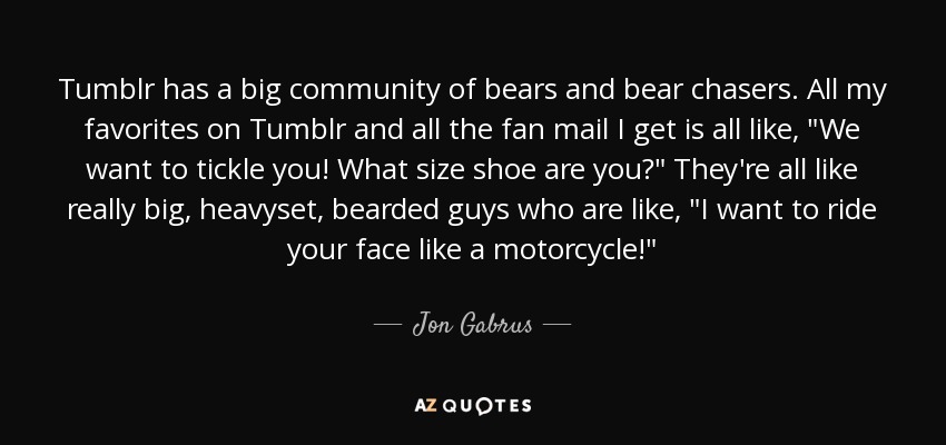 Tumblr has a big community of bears and bear chasers. All my favorites on Tumblr and all the fan mail I get is all like, "We want to tickle you! What size shoe are you?" They're all like really big, heavyset, bearded guys who are like, "I want to ride your face like a motorcycle!"