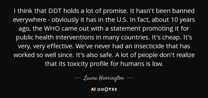 I think that DDT holds a lot of promise. It hasn't been banned everywhere - obviously it has in the U.S. In fact, about 10 years ago, the WHO came out with a statement promoting it for public health interventions in many countries. It's cheap. It's very, very effective. We've never had an insecticide that has worked so well since. It's also safe. A lot of people don't realize that its toxicity profile for humans is low.