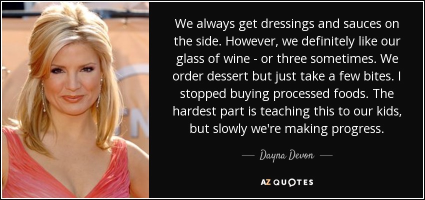 We always get dressings and sauces on the side. However, we definitely like our glass of wine - or three sometimes. We order dessert but just take a few bites. I stopped buying processed foods. The hardest part is teaching this to our kids, but slowly we're making progress.