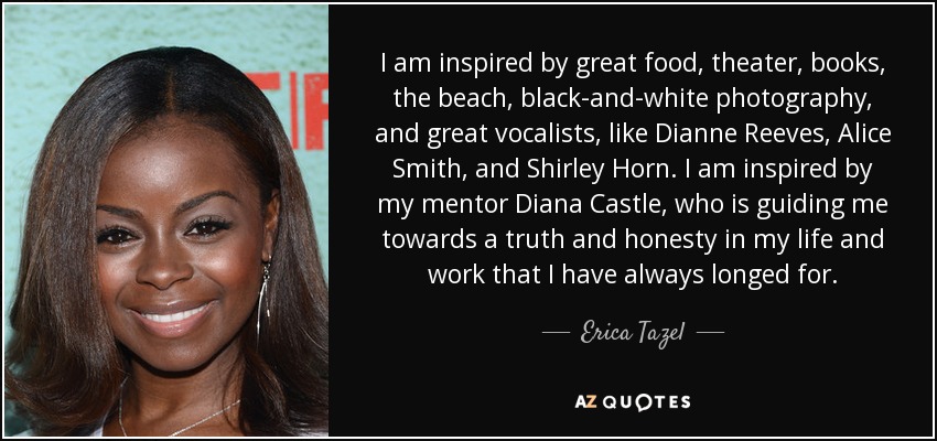 I am inspired by great food, theater, books, the beach, black-and-white photography, and great vocalists, like Dianne Reeves, Alice Smith, and Shirley Horn. I am inspired by my mentor Diana Castle, who is guiding me towards a truth and honesty in my life and work that I have always longed for.