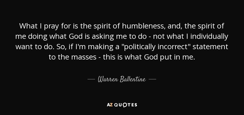 What I pray for is the spirit of humbleness, and, the spirit of me doing what God is asking me to do - not what I individually want to do. So, if I'm making a "politically incorrect" statement to the masses - this is what God put in me.