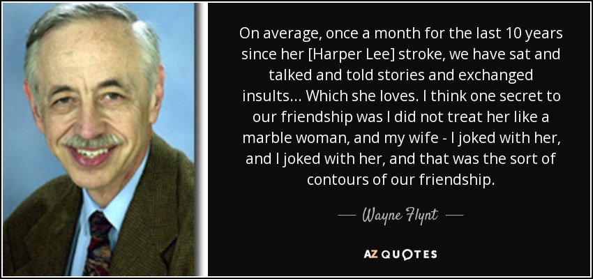 On average, once a month for the last 10 years since her [Harper Lee] stroke, we have sat and talked and told stories and exchanged insults... Which she loves. I think one secret to our friendship was I did not treat her like a marble woman, and my wife - I joked with her, and I joked with her, and that was the sort of contours of our friendship.