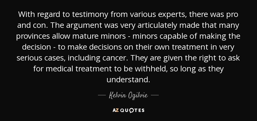 With regard to testimony from various experts, there was pro and con. The argument was very articulately made that many provinces allow mature minors - minors capable of making the decision - to make decisions on their own treatment in very serious cases, including cancer. They are given the right to ask for medical treatment to be withheld, so long as they understand.