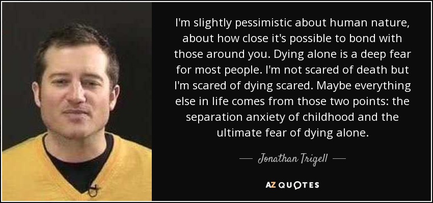 I'm slightly pessimistic about human nature, about how close it's possible to bond with those around you. Dying alone is a deep fear for most people. I'm not scared of death but I'm scared of dying scared. Maybe everything else in life comes from those two points: the separation anxiety of childhood and the ultimate fear of dying alone.