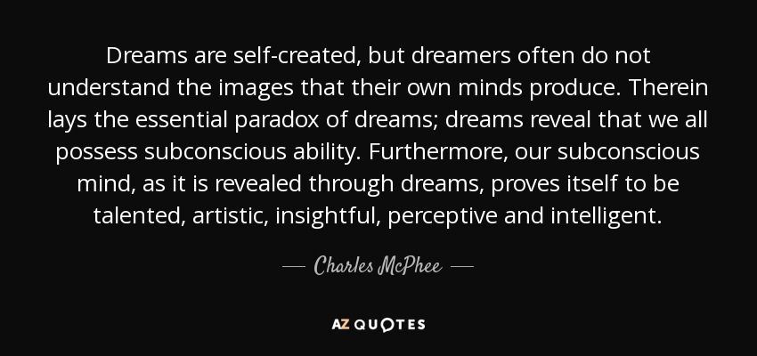 Dreams are self-created, but dreamers often do not understand the images that their own minds produce. Therein lays the essential paradox of dreams; dreams reveal that we all possess subconscious ability. Furthermore, our subconscious mind, as it is revealed through dreams, proves itself to be talented, artistic, insightful, perceptive and intelligent.