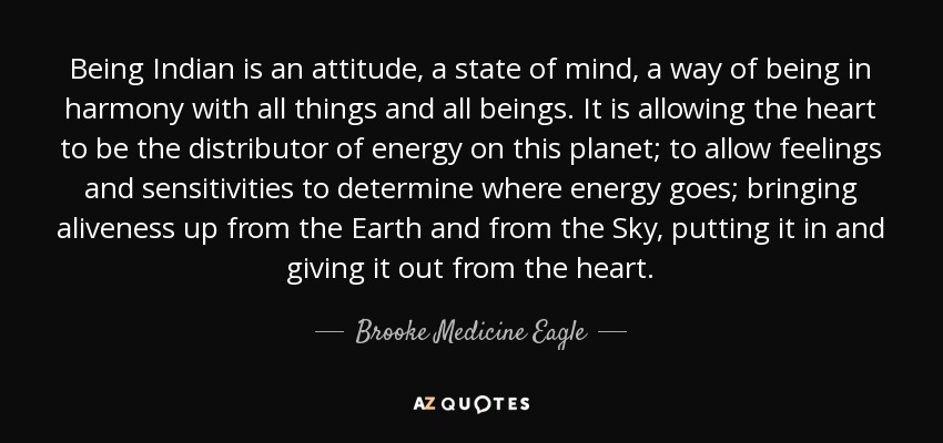 Being Indian is an attitude, a state of mind, a way of being in harmony with all things and all beings. It is allowing the heart to be the distributor of energy on this planet; to allow feelings and sensitivities to determine where energy goes; bringing aliveness up from the Earth and from the Sky, putting it in and giving it out from the heart.