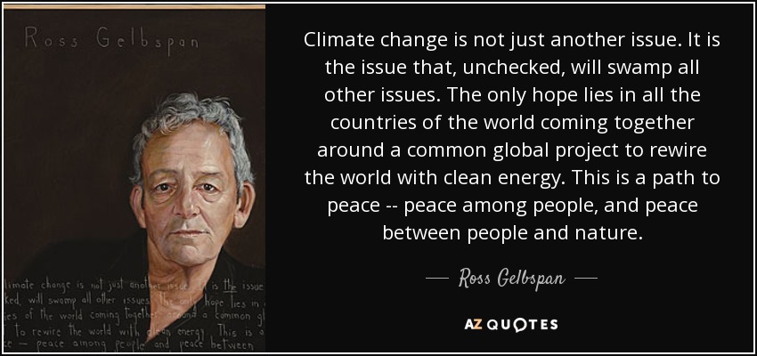 Climate change is not just another issue. It is the issue that, unchecked, will swamp all other issues. The only hope lies in all the countries of the world coming together around a common global project to rewire the world with clean energy. This is a path to peace -- peace among people, and peace between people and nature.