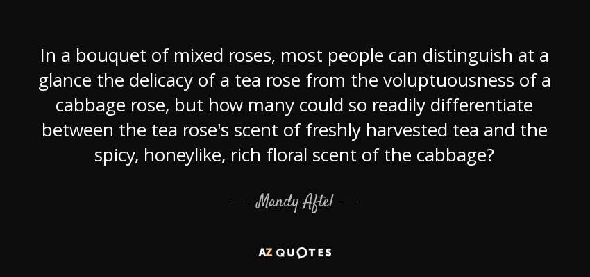 In a bouquet of mixed roses, most people can distinguish at a glance the delicacy of a tea rose from the voluptuousness of a cabbage rose, but how many could so readily differentiate between the tea rose's scent of freshly harvested tea and the spicy, honeylike, rich floral scent of the cabbage?