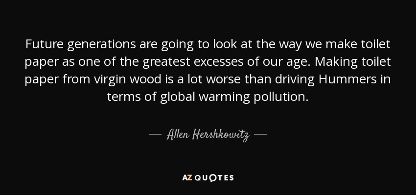 Future generations are going to look at the way we make toilet paper as one of the greatest excesses of our age. Making toilet paper from virgin wood is a lot worse than driving Hummers in terms of global warming pollution.