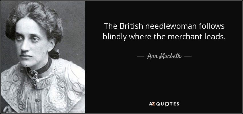 The British needlewoman follows blindly where the merchant leads.