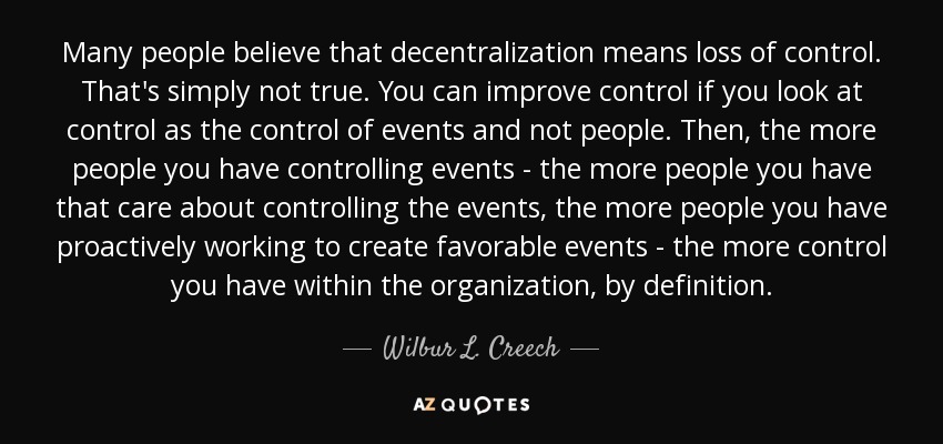 Many people believe that decentralization means loss of control. That's simply not true. You can improve control if you look at control as the control of events and not people. Then, the more people you have controlling events - the more people you have that care about controlling the events, the more people you have proactively working to create favorable events - the more control you have within the organization, by definition.