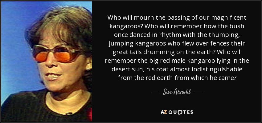 Who will mourn the passing of our magnificent kangaroos? Who will remember how the bush once danced in rhythm with the thumping, jumping kangaroos who flew over fences their great tails drumming on the earth? Who will remember the big red male kangaroo lying in the desert sun, his coat almost indistinguishable from the red earth from which he came?