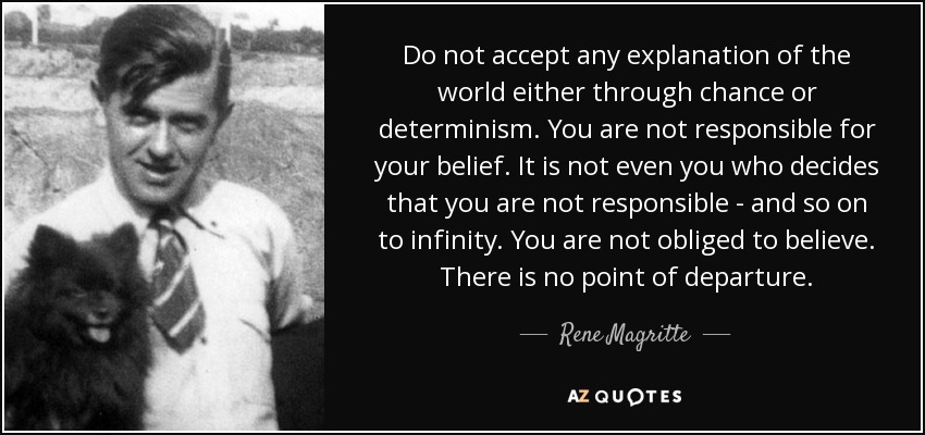 Do not accept any explanation of the world either through chance or determinism. You are not responsible for your belief. It is not even you who decides that you are not responsible - and so on to infinity. You are not obliged to believe. There is no point of departure.