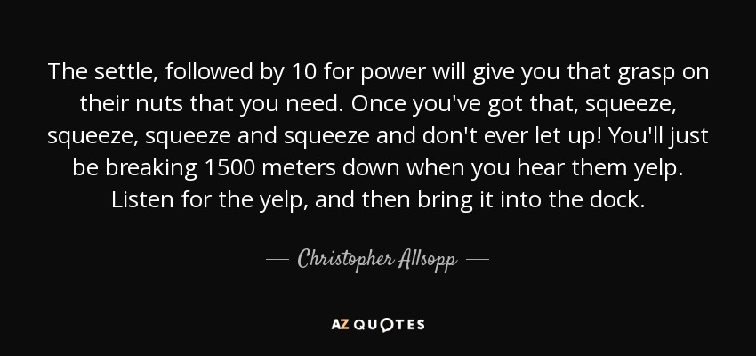 The settle, followed by 10 for power will give you that grasp on their nuts that you need. Once you've got that, squeeze, squeeze, squeeze and squeeze and don't ever let up! You'll just be breaking 1500 meters down when you hear them yelp. Listen for the yelp, and then bring it into the dock.