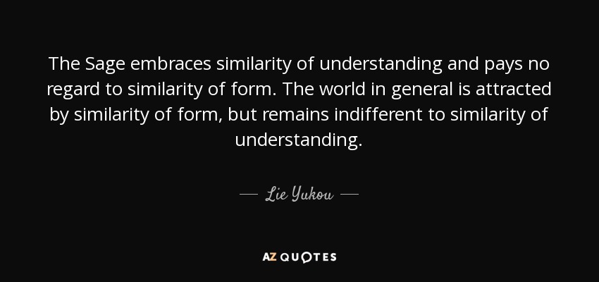 The Sage embraces similarity of understanding and pays no regard to similarity of form. The world in general is attracted by similarity of form, but remains indifferent to similarity of understanding.