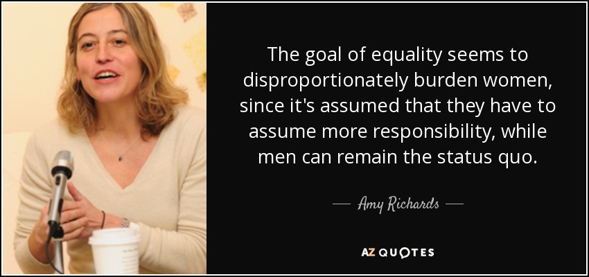 The goal of equality seems to disproportionately burden women, since it's assumed that they have to assume more responsibility, while men can remain the status quo.