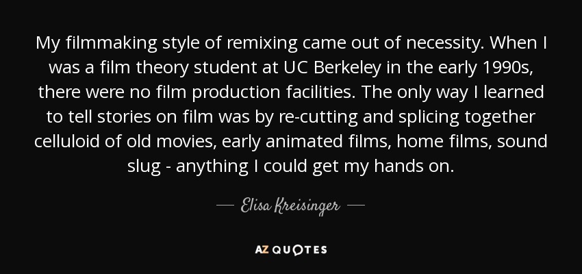 My filmmaking style of remixing came out of necessity. When I was a film theory student at UC Berkeley in the early 1990s, there were no film production facilities. The only way I learned to tell stories on film was by re-cutting and splicing together celluloid of old movies, early animated films, home films, sound slug - anything I could get my hands on.