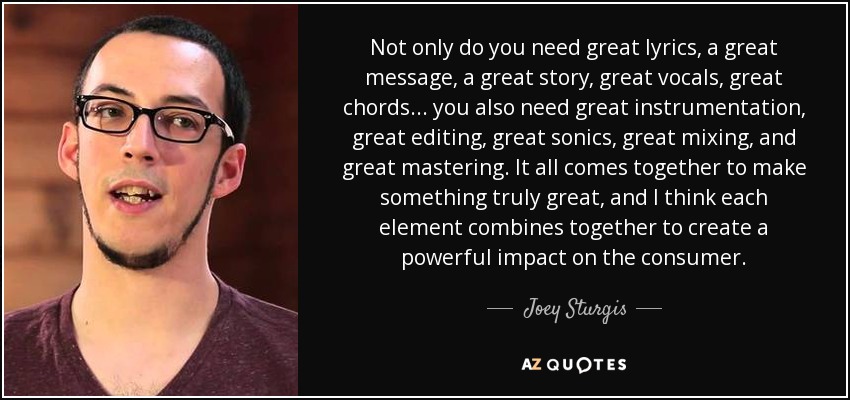 Not only do you need great lyrics, a great message, a great story, great vocals, great chords... you also need great instrumentation, great editing, great sonics, great mixing, and great mastering. It all comes together to make something truly great, and I think each element combines together to create a powerful impact on the consumer.