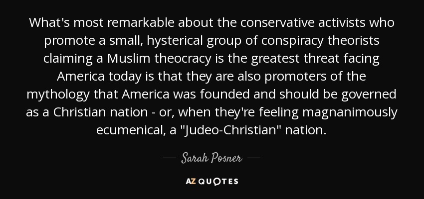 What's most remarkable about the conservative activists who promote a small, hysterical group of conspiracy theorists claiming a Muslim theocracy is the greatest threat facing America today is that they are also promoters of the mythology that America was founded and should be governed as a Christian nation - or, when they're feeling magnanimously ecumenical, a "Judeo-Christian" nation.