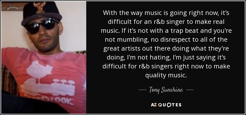 With the way music is going right now, it's difficult for an r&b singer to make real music. If it's not with a trap beat and you're not mumbling, no disrespect to all of the great artists out there doing what they're doing, I'm not hating, I'm just saying it's difficult for r&b singers right now to make quality music.