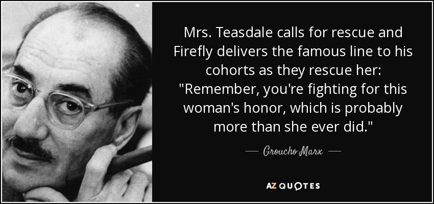 Mrs. Teasdale calls for rescue and Firefly delivers the famous line to his cohorts as they rescue her: "Remember, you're fighting for this woman's honor, which is probably more than she ever did."