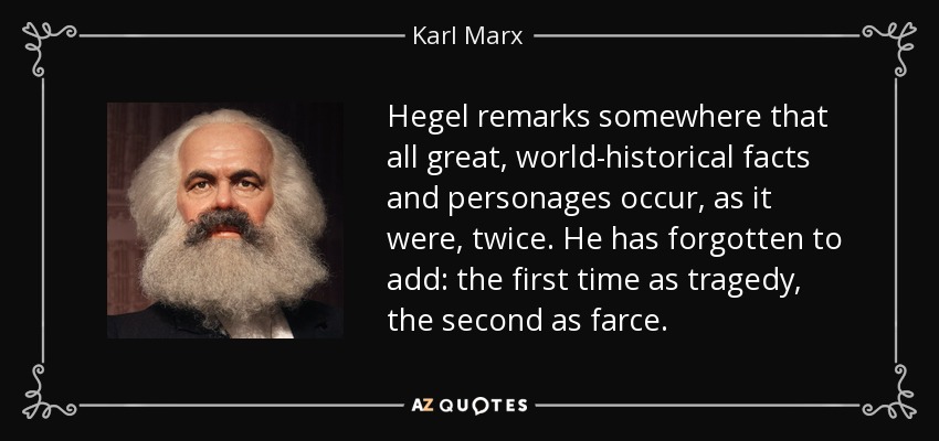 Hegel remarks somewhere that all great, world-historical facts and personages occur, as it were, twice. He has forgotten to add: the first time as tragedy, the second as farce.