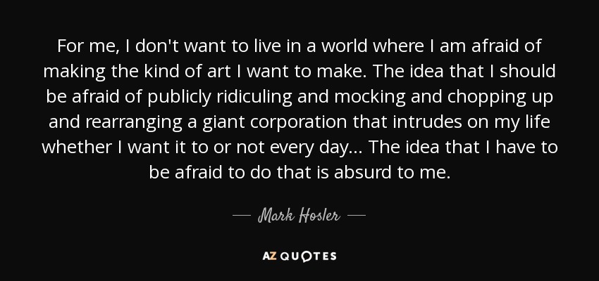 For me, I don't want to live in a world where I am afraid of making the kind of art I want to make. The idea that I should be afraid of publicly ridiculing and mocking and chopping up and rearranging a giant corporation that intrudes on my life whether I want it to or not every day... The idea that I have to be afraid to do that is absurd to me.