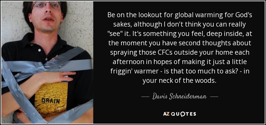 Be on the lookout for global warming for God's sakes, although I don't think you can really "see" it. It's something you feel, deep inside, at the moment you have second thoughts about spraying those CFCs outside your home each afternoon in hopes of making it just a little friggin' warmer - is that too much to ask? - in your neck of the woods.