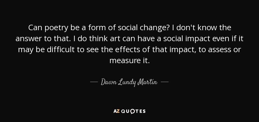 Can poetry be a form of social change? I don't know the answer to that. I do think art can have a social impact even if it may be difficult to see the effects of that impact, to assess or measure it.