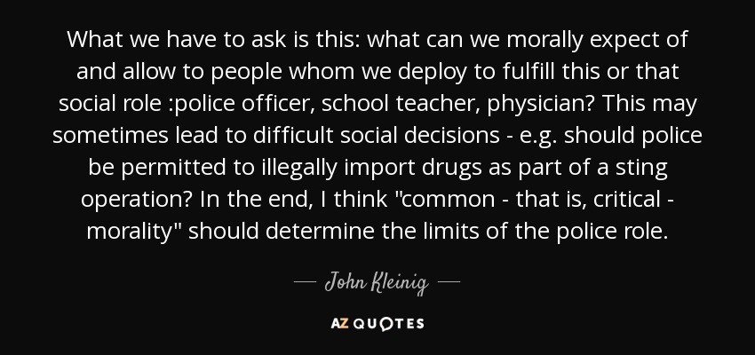 What we have to ask is this: what can we morally expect of and allow to people whom we deploy to fulfill this or that social role :police officer, school teacher, physician? This may sometimes lead to difficult social decisions - e.g. should police be permitted to illegally import drugs as part of a sting operation? In the end, I think "common - that is, critical - morality" should determine the limits of the police role.