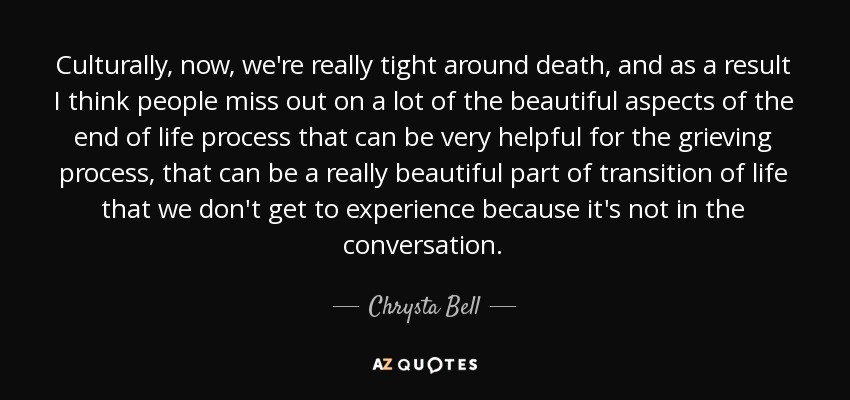 Culturally, now, we're really tight around death, and as a result I think people miss out on a lot of the beautiful aspects of the end of life process that can be very helpful for the grieving process, that can be a really beautiful part of transition of life that we don't get to experience because it's not in the conversation.
