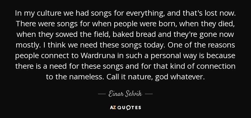 In my culture we had songs for everything, and that's lost now. There were songs for when people were born, when they died, when they sowed the field, baked bread and they're gone now mostly. I think we need these songs today. One of the reasons people connect to Wardruna in such a personal way is because there is a need for these songs and for that kind of connection to the nameless. Call it nature, god whatever.