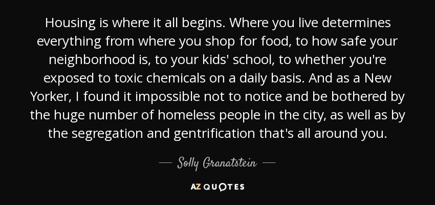 Housing is where it all begins. Where you live determines everything from where you shop for food, to how safe your neighborhood is, to your kids' school, to whether you're exposed to toxic chemicals on a daily basis. And as a New Yorker, I found it impossible not to notice and be bothered by the huge number of homeless people in the city, as well as by the segregation and gentrification that's all around you.