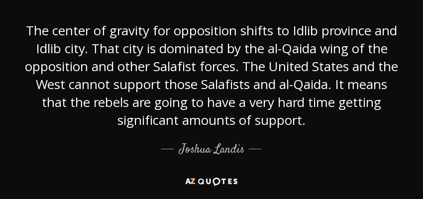 The center of gravity for opposition shifts to Idlib province and Idlib city. That city is dominated by the al-Qaida wing of the opposition and other Salafist forces. The United States and the West cannot support those Salafists and al-Qaida. It means that the rebels are going to have a very hard time getting significant amounts of support.