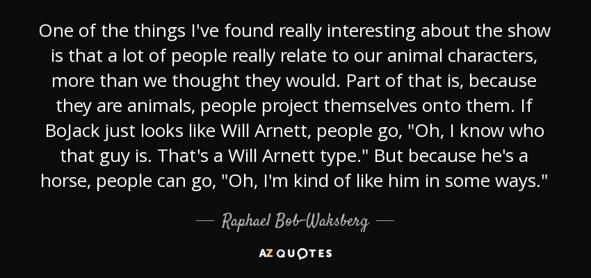 One of the things I've found really interesting about the show is that a lot of people really relate to our animal characters, more than we thought they would. Part of that is, because they are animals, people project themselves onto them. If BoJack just looks like Will Arnett, people go, "Oh, I know who that guy is. That's a Will Arnett type." But because he's a horse, people can go, "Oh, I'm kind of like him in some ways."
