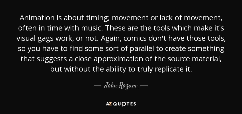 Animation is about timing; movement or lack of movement, often in time with music. These are the tools which make it's visual gags work, or not. Again, comics don't have those tools, so you have to find some sort of parallel to create something that suggests a close approximation of the source material, but without the ability to truly replicate it.