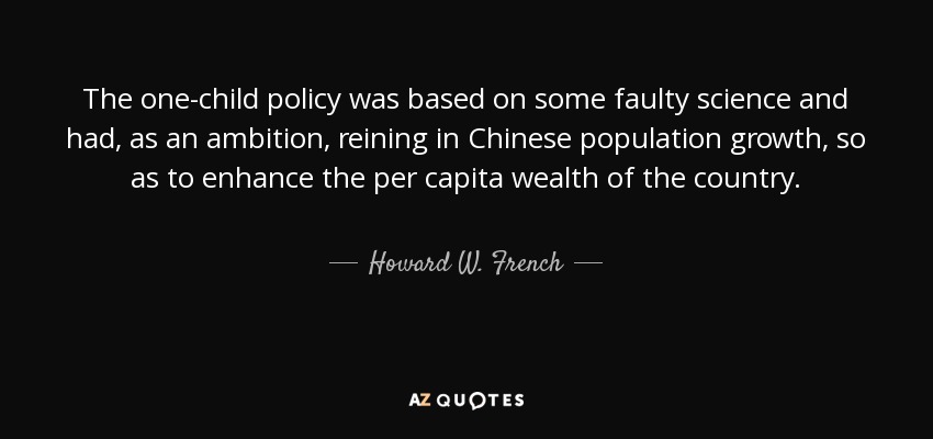 The one-child policy was based on some faulty science and had, as an ambition, reining in Chinese population growth, so as to enhance the per capita wealth of the country.