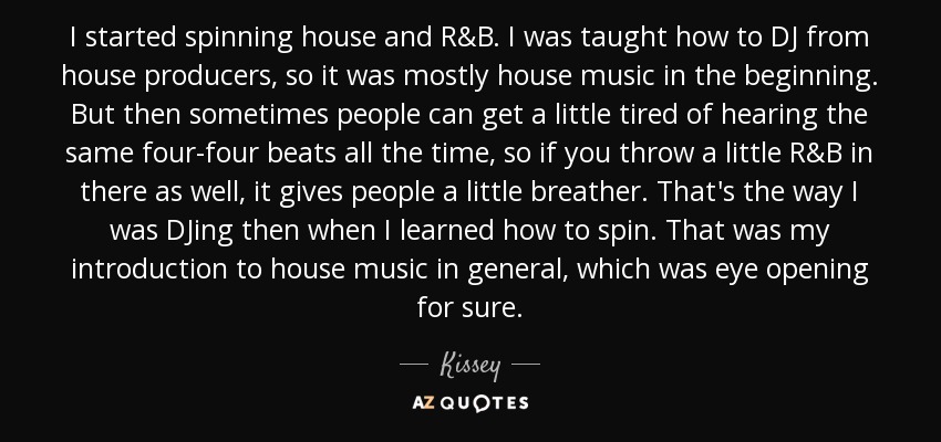 I started spinning house and R&B. I was taught how to DJ from house producers, so it was mostly house music in the beginning. But then sometimes people can get a little tired of hearing the same four-four beats all the time, so if you throw a little R&B in there as well, it gives people a little breather. That's the way I was DJing then when I learned how to spin. That was my introduction to house music in general, which was eye opening for sure.