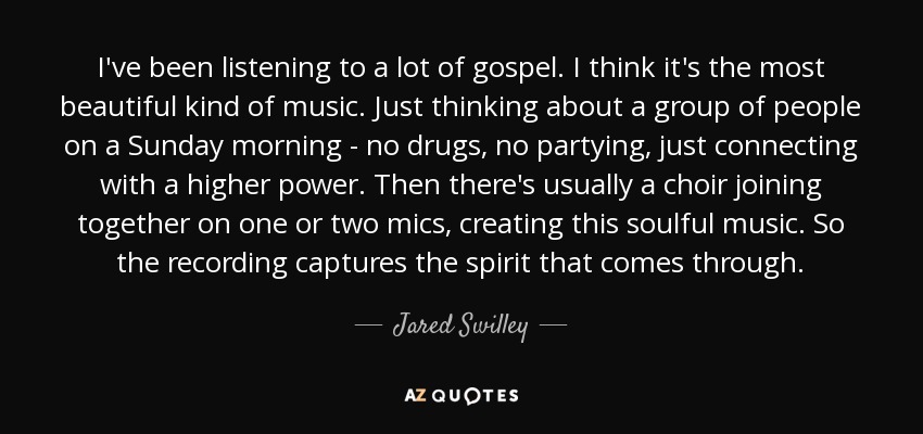 I've been listening to a lot of gospel. I think it's the most beautiful kind of music. Just thinking about a group of people on a Sunday morning - no drugs, no partying, just connecting with a higher power. Then there's usually a choir joining together on one or two mics, creating this soulful music. So the recording captures the spirit that comes through.