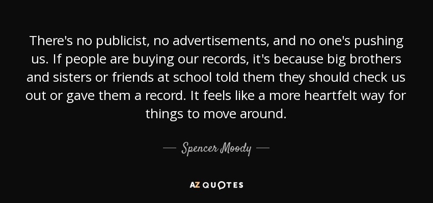 There's no publicist, no advertisements, and no one's pushing us. If people are buying our records, it's because big brothers and sisters or friends at school told them they should check us out or gave them a record. It feels like a more heartfelt way for things to move around.