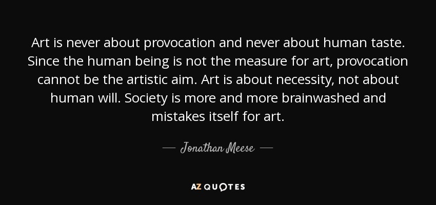 Art is never about provocation and never about human taste. Since the human being is not the measure for art, provocation cannot be the artistic aim. Art is about necessity, not about human will. Society is more and more brainwashed and mistakes itself for art.