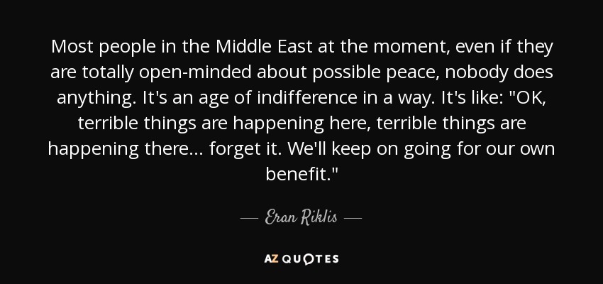 Most people in the Middle East at the moment, even if they are totally open-minded about possible peace, nobody does anything. It's an age of indifference in a way. It's like: "OK, terrible things are happening here, terrible things are happening there... forget it. We'll keep on going for our own benefit."