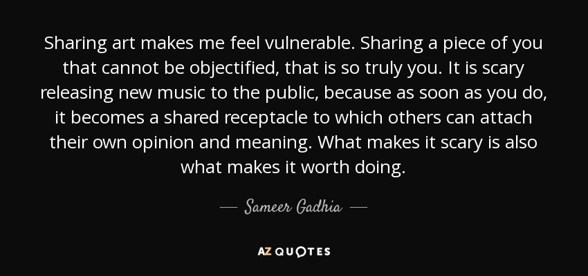 Sharing art makes me feel vulnerable. Sharing a piece of you that cannot be objectified, that is so truly you. It is scary releasing new music to the public, because as soon as you do, it becomes a shared receptacle to which others can attach their own opinion and meaning. What makes it scary is also what makes it worth doing.