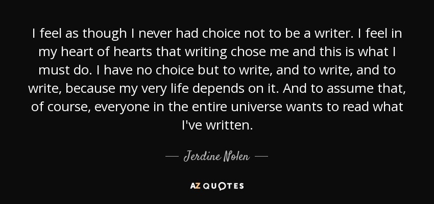 I feel as though I never had choice not to be a writer. I feel in my heart of hearts that writing chose me and this is what I must do. I have no choice but to write, and to write, and to write, because my very life depends on it. And to assume that, of course, everyone in the entire universe wants to read what I've written.