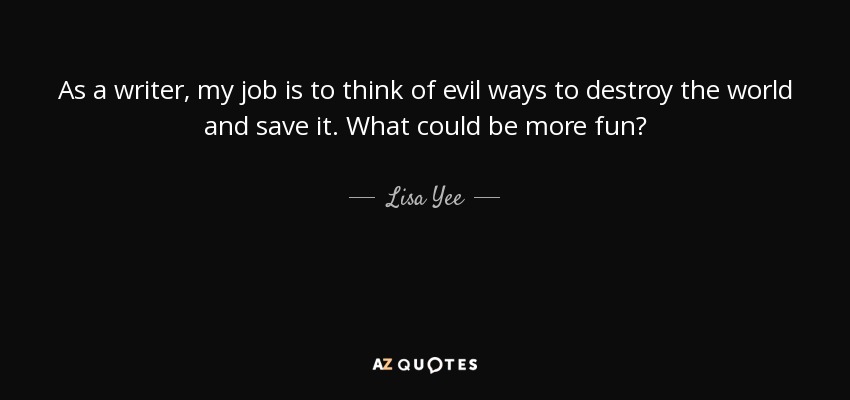 As a writer, my job is to think of evil ways to destroy the world and save it. What could be more fun?