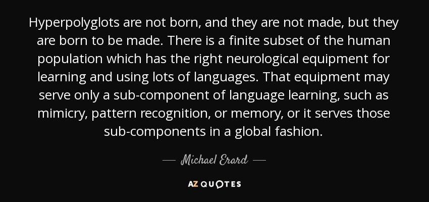 Hyperpolyglots are not born, and they are not made, but they are born to be made. There is a finite subset of the human population which has the right neurological equipment for learning and using lots of languages. That equipment may serve only a sub-component of language learning, such as mimicry, pattern recognition, or memory, or it serves those sub-components in a global fashion.