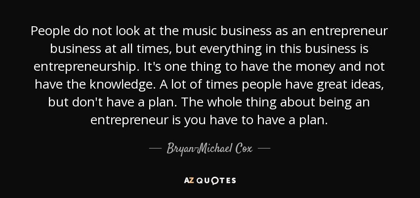 People do not look at the music business as an entrepreneur business at all times, but everything in this business is entrepreneurship. It's one thing to have the money and not have the knowledge. A lot of times people have great ideas, but don't have a plan. The whole thing about being an entrepreneur is you have to have a plan.